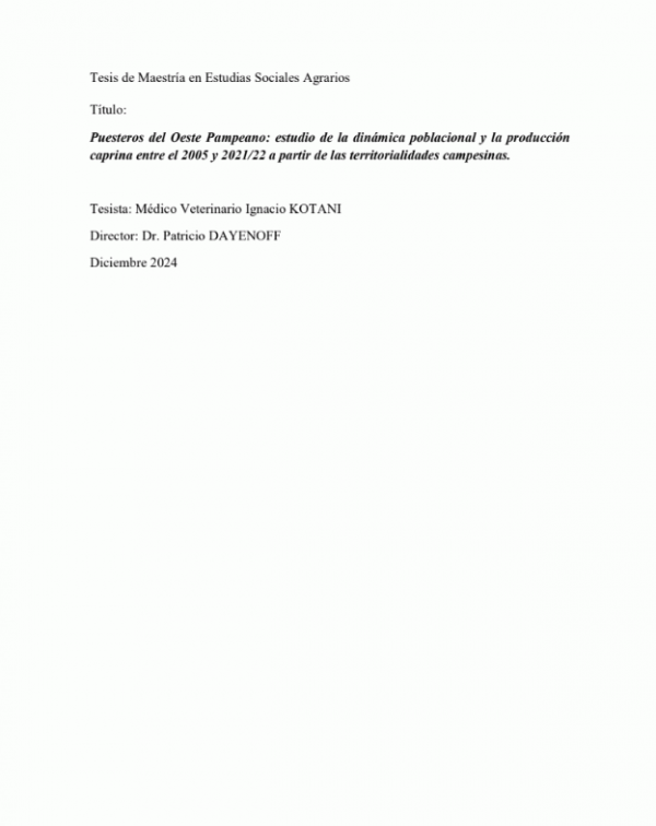 Puesteros del oeste pampeano : estudio de la dinámica poblacional y la producción caprina entre el 2005 y 2021/22 a partir de las territorialidades campesinas / Médico Veterinario Ignacio Kotani [Texto]