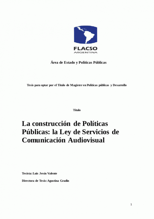 La construcción de políticas públicas : la Ley de Servicios de Comunicación Audiovisual / Luis Jesús Valente [Recurso electrónico]