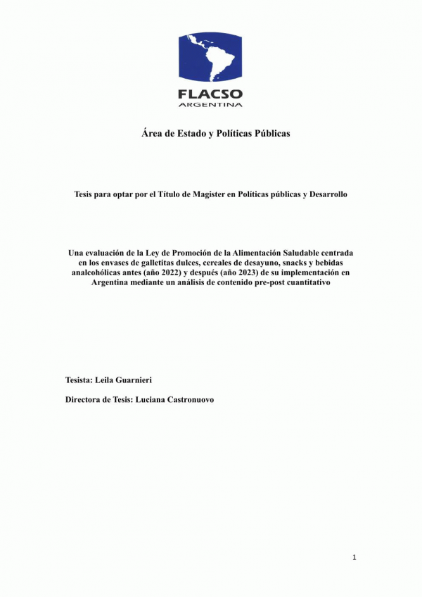 Una evaluación de la Ley de Promoción de la Alimentación Saludable centrada en los envases de galletitas dulces, cereales de desayuno, snacks y bebidas analcohólicas antes ( año 2022 ) y después ( año 2023 ) de su implementación en Argentina mediante un análisis de contenido pre-post cuantitativo / Leila Guarnieri [Recurso electrónico]