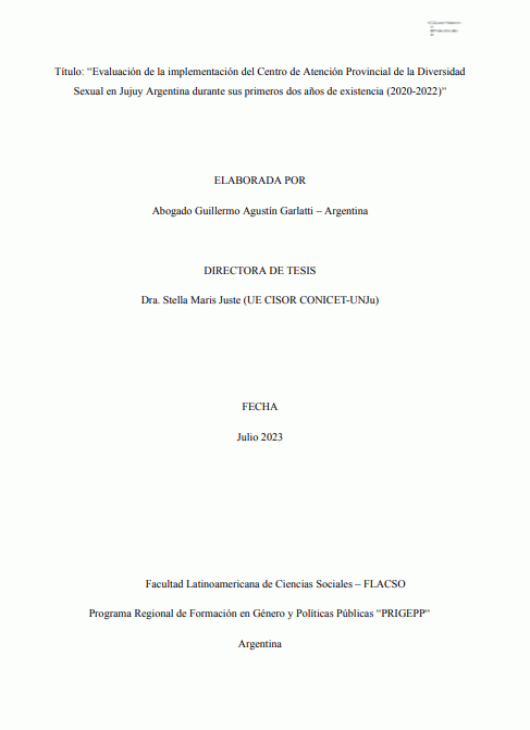 Evaluación de la implementación del Centro de Atención Provincial de la Diversidad Sexual en Jujuy Argentina durante sus primeros dos años de existencia ( 2020 - 2022 ) / Abogado Guillermo Agustín Garlatti [Recurso electrónico]
