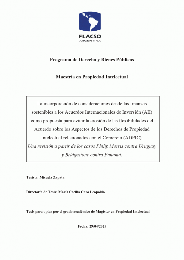 La incorporación de consideraciones desde las finanzas sostenibles a los Acuerdos Internacionales de Inversión (AII) como propuesta para evitar la erosión de las flexibilidades del Acuerdo sobre los Aspectos de los Derechos de Propiedad Intelectual relacionados con el Comercio (ADPIC) : una revisión a partir de los casos Phillip Morris contra Uruguay y Bridgestone contra Panamá / Micaela Zapata [Recurso electrónico]