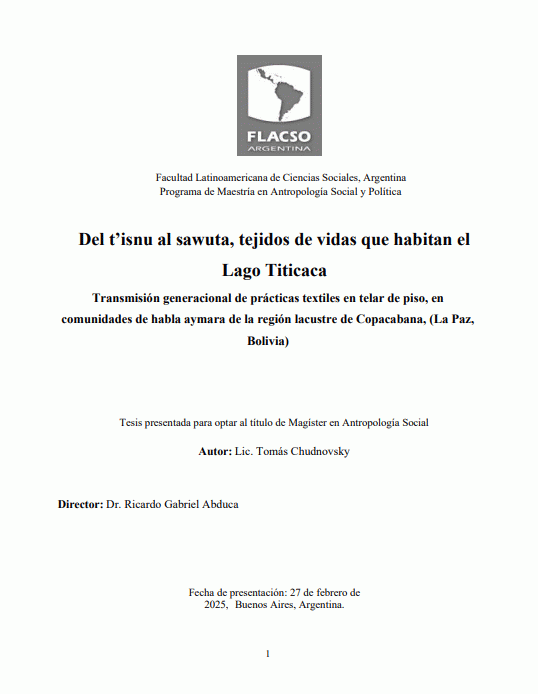 Del t’isnu al sawuta, tejidos de vidas que habitan el Lago Titicaca : transmisión generacional de prácticas textiles en telar de piso, en comunidades de habla aymara de la región lacustre de Copacabana, (La Paz, Bolivia) / Lic. Tomás Chudnovsky [Recurso electrónico]