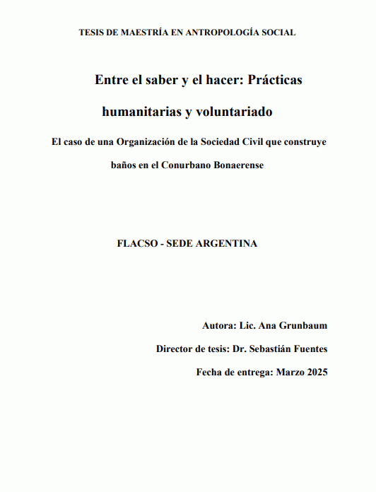 Entre el saber y el hacer : prácticas humanitarias y voluntariado. El caso de una Organización de la Sociedad Civil que construye baños en el Conurbano Bonaerense / Lic. Ana Grunbaum [Recurso electrónico]