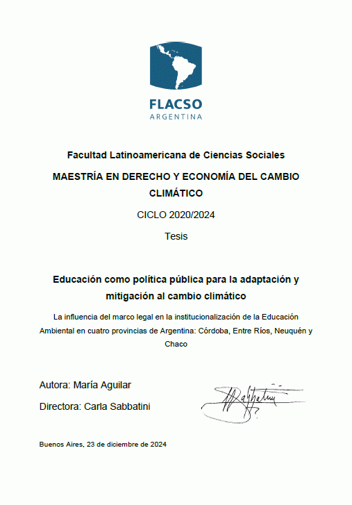 Educación como política pública para la adaptación y mitigación al cambio climático : la influencia del marco legal en la institucionalización de la Educación Ambiental en cuatro provincias de Argentina: Córdoba, Entre Ríos, Neuquén y Chaco / María Aguilar [Recurso electrónico]